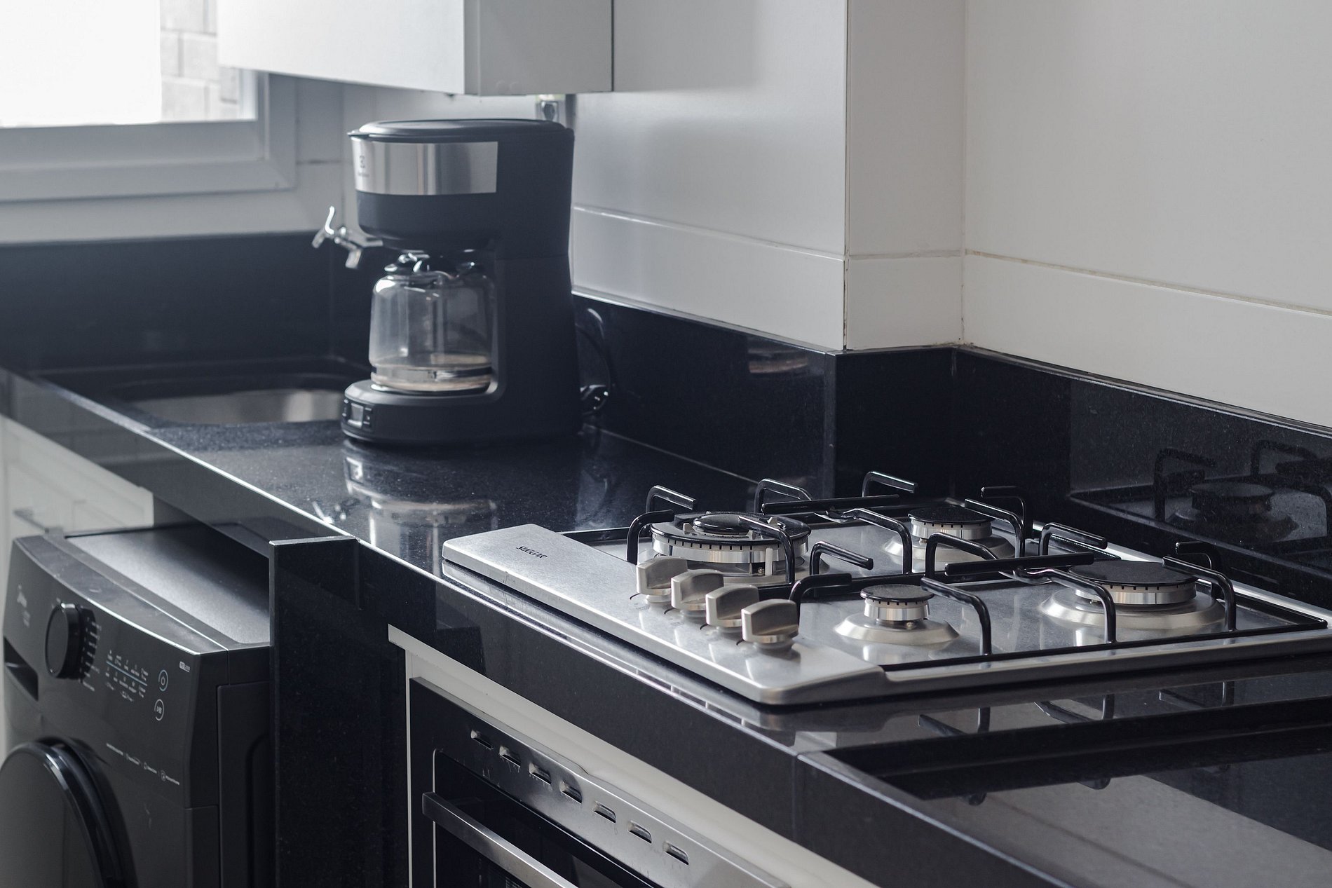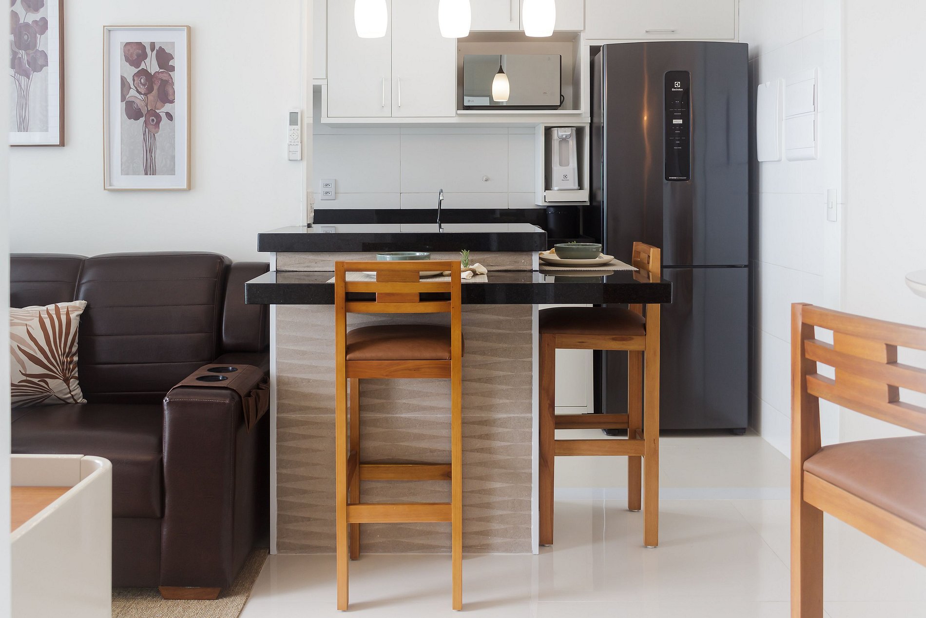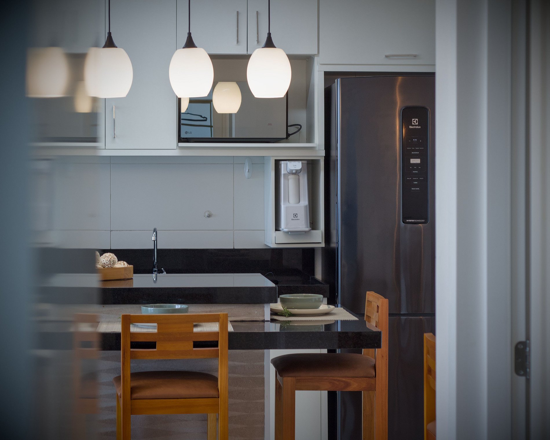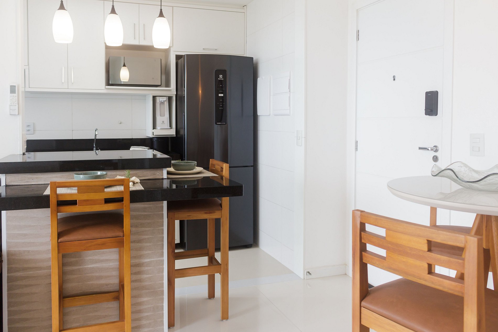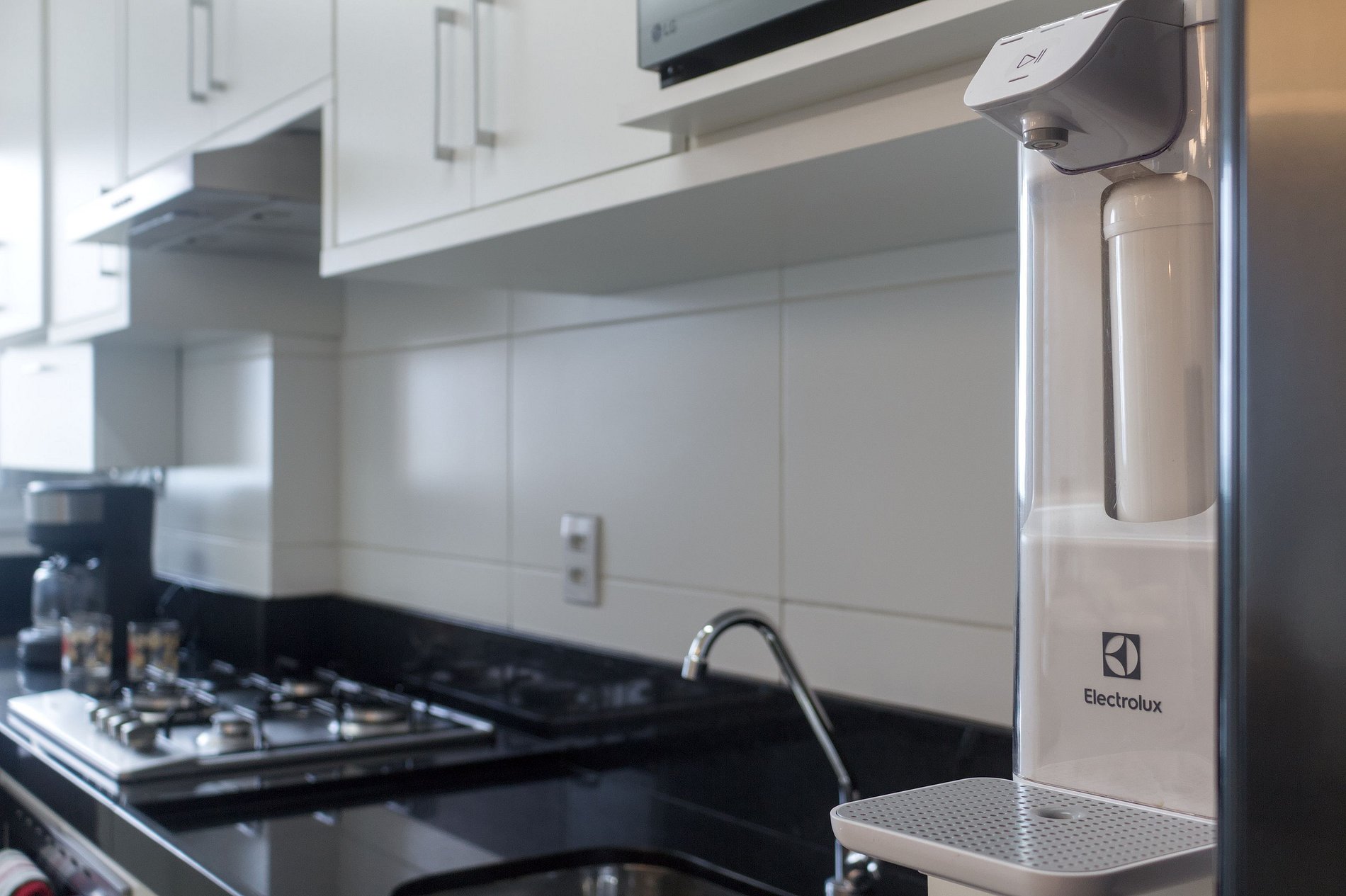 A cozinha é equipada para o dia a dia: fogão, forno, micro-ondas, air fryer, geladeira, liquidificador, sanduicheira e utensílios completos. Filtro de água gelada e natural incluso. A lavanderia integrada conta com lava e seca — sem depender de serviço externo. Banheiros com aquecimento a gás e boa pressão de água. Wi-fi fibra ótica. Smart TV na sala com acesso a streaming mediante conta do hóspede. Fechadura eletrônica. Vaga coberta incluída.