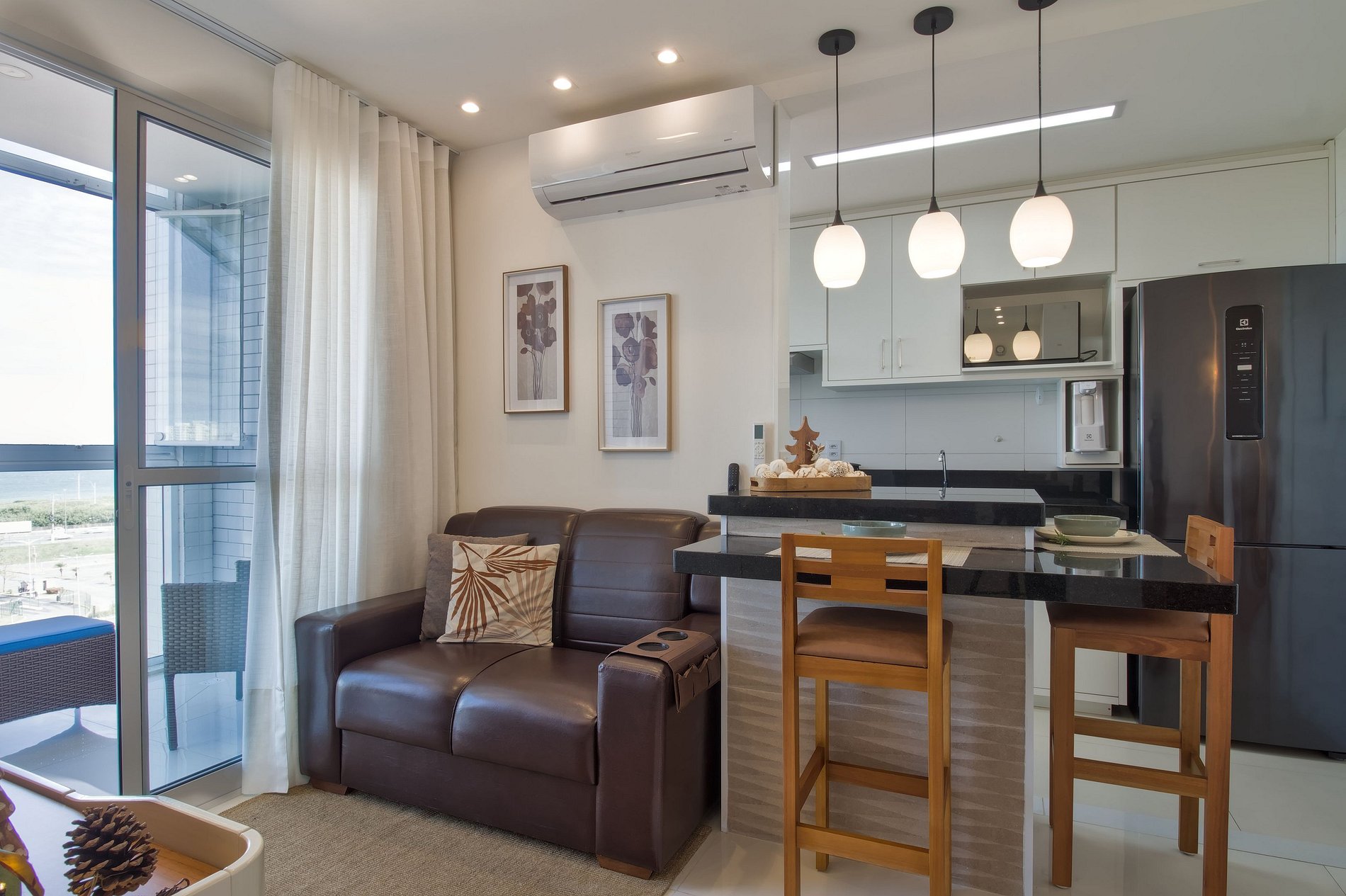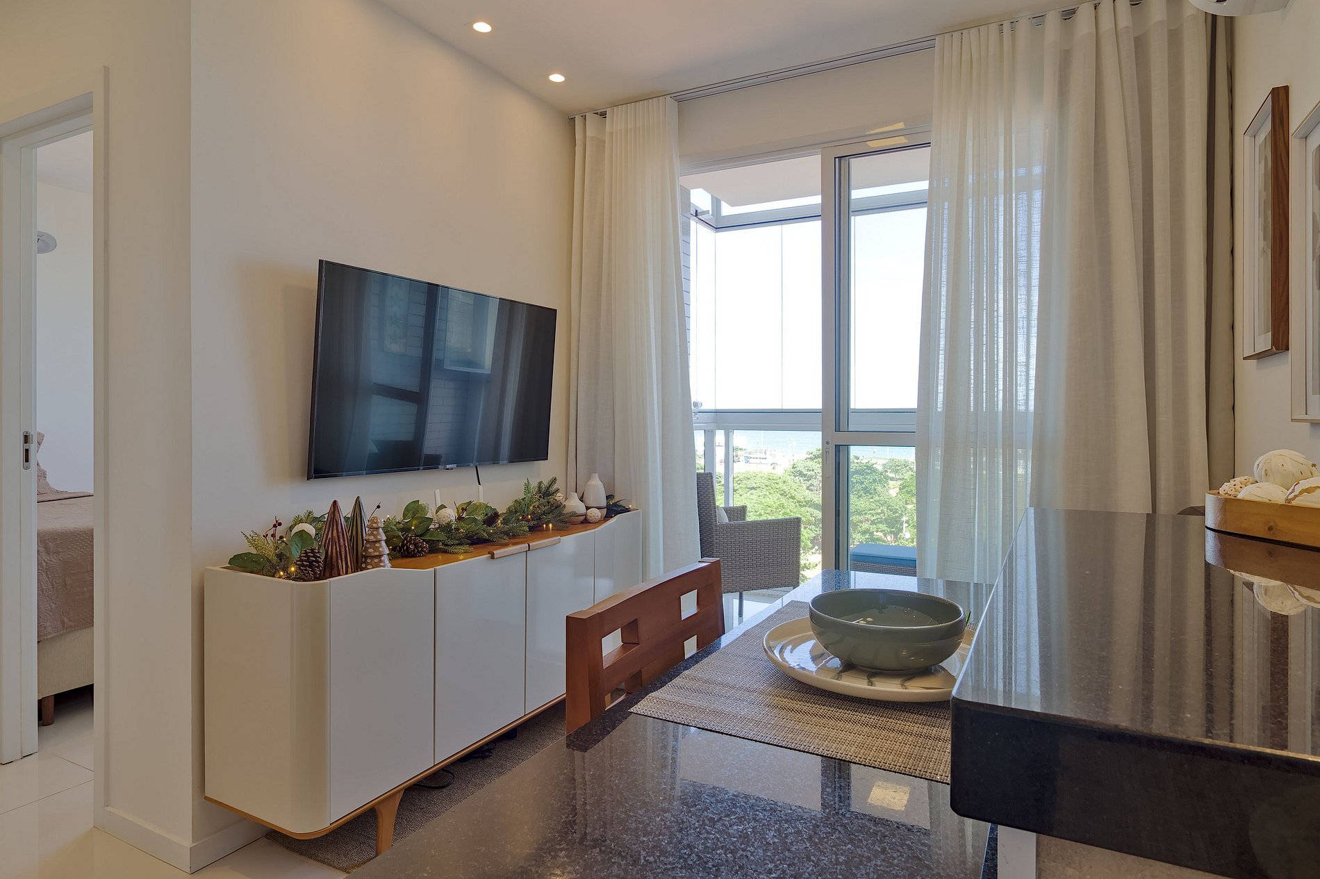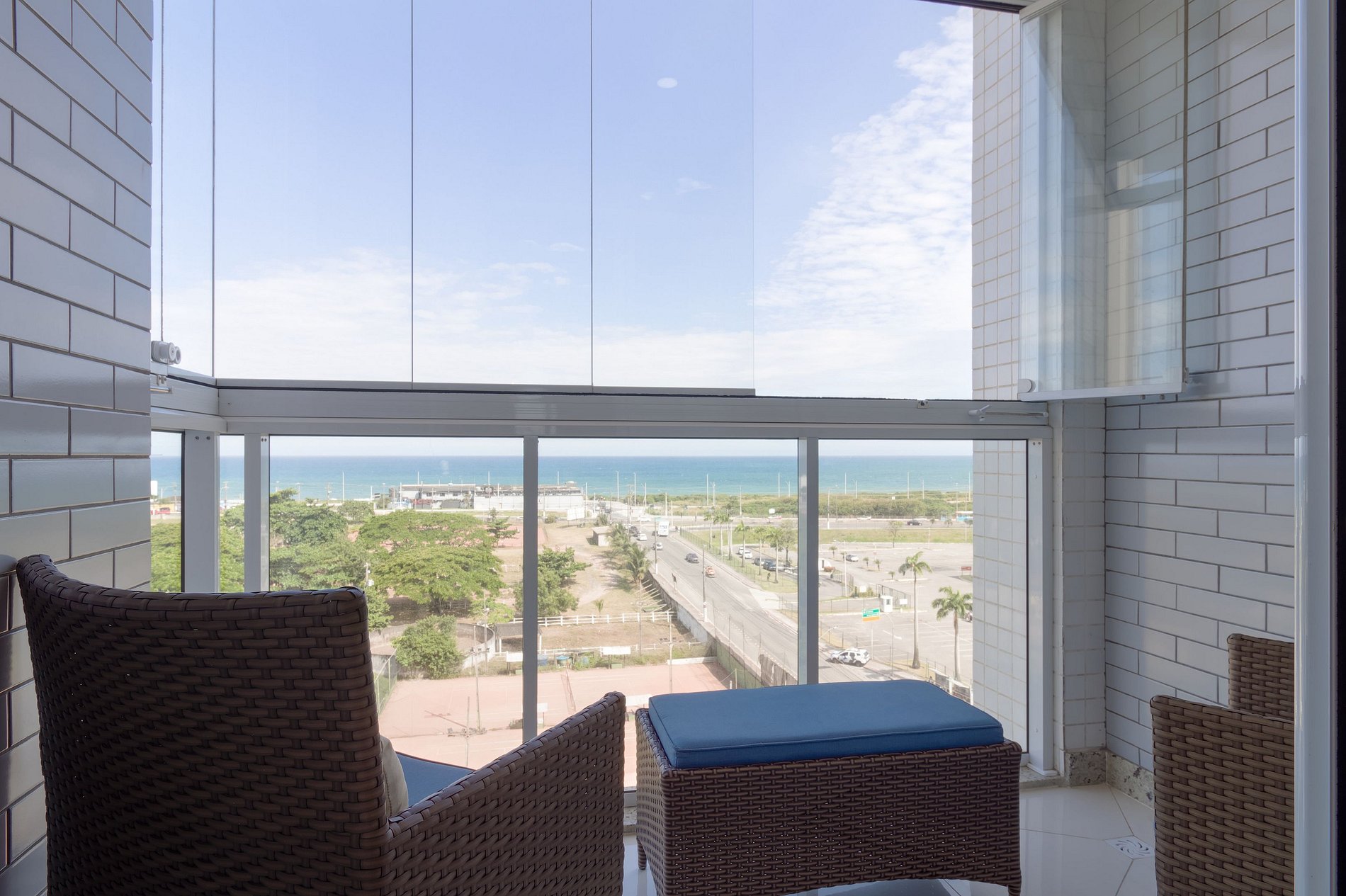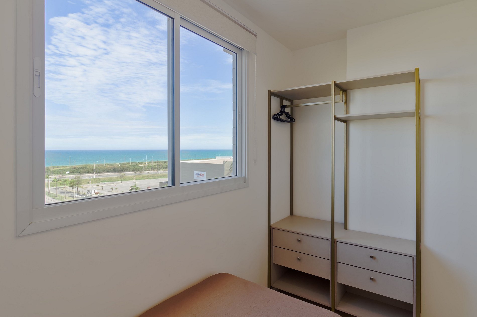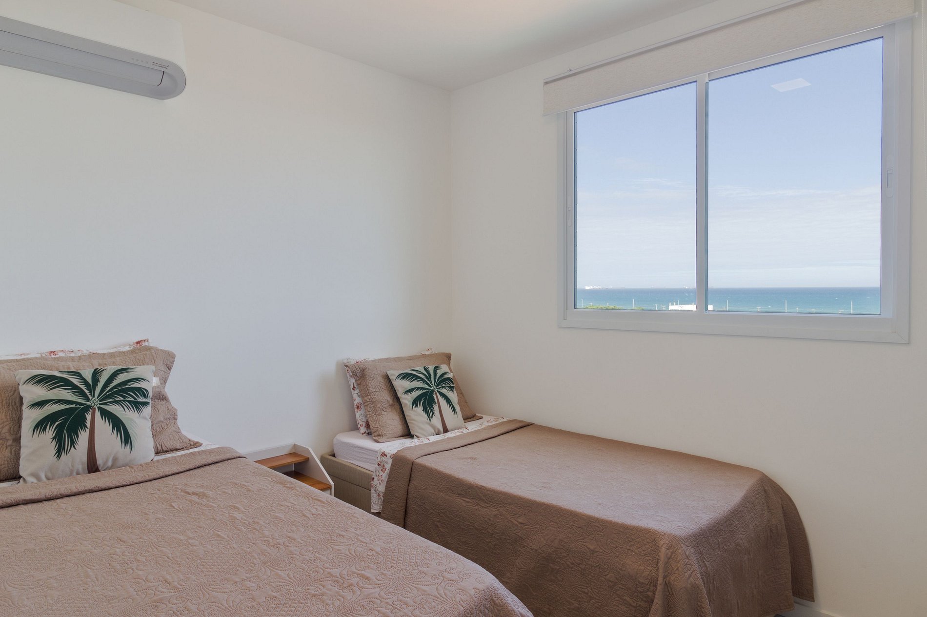 O quarto 1 é suíte — cama de casal, ar-condicionado, arara e blackout. O quarto 2 tem duas camas de solteiro, arara, ar-condicionado e vista para o mar. A sala tem ar-condicionado e varanda fechada com poltronas e vista para o Jockey e o mar.