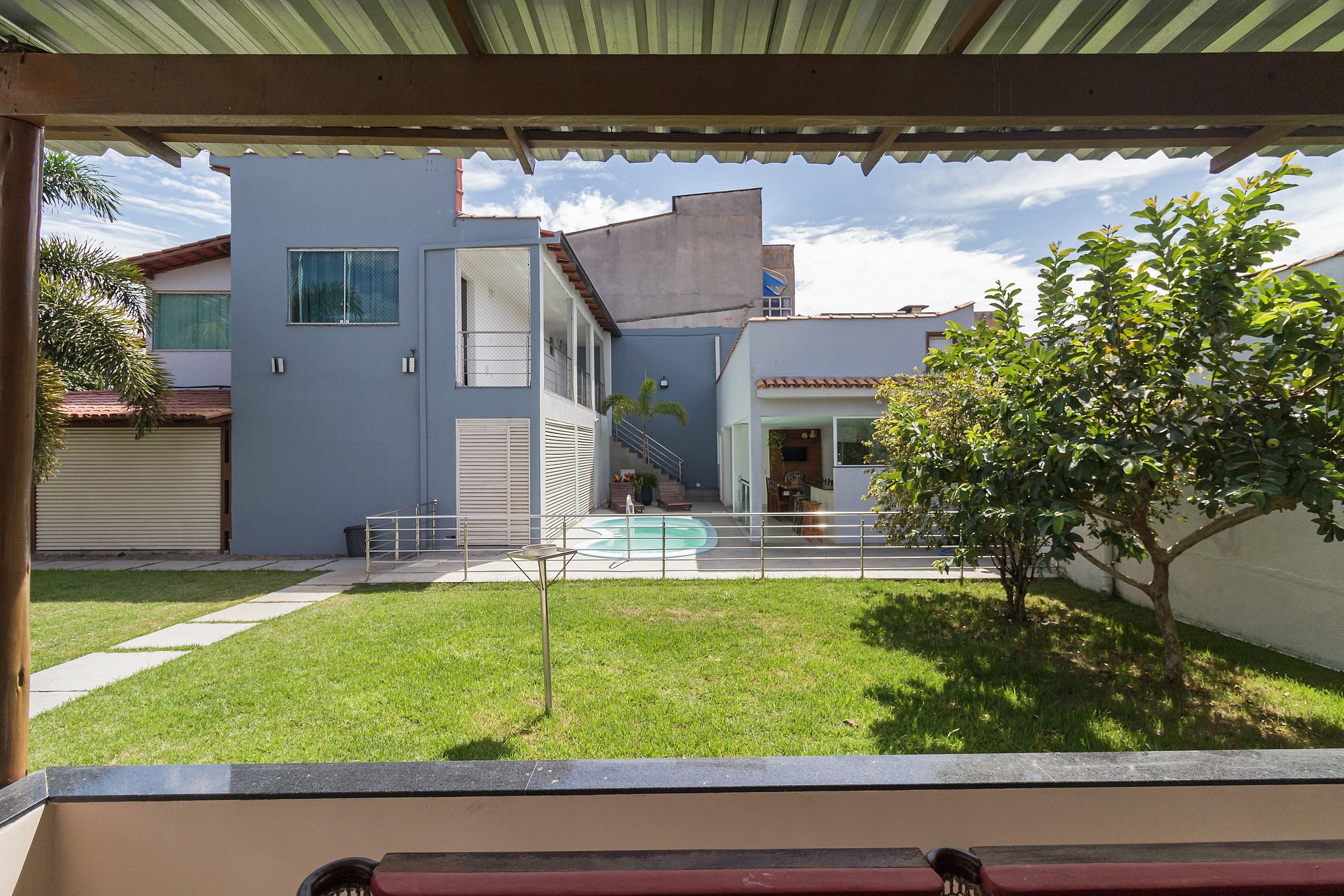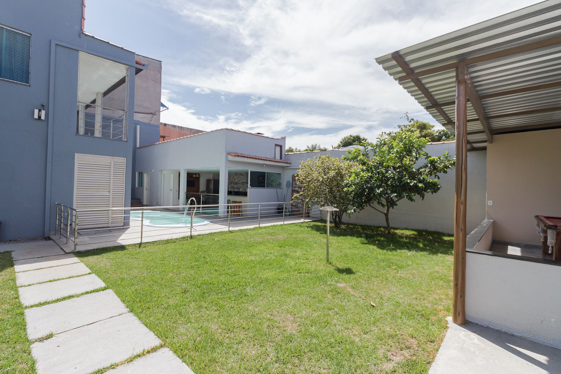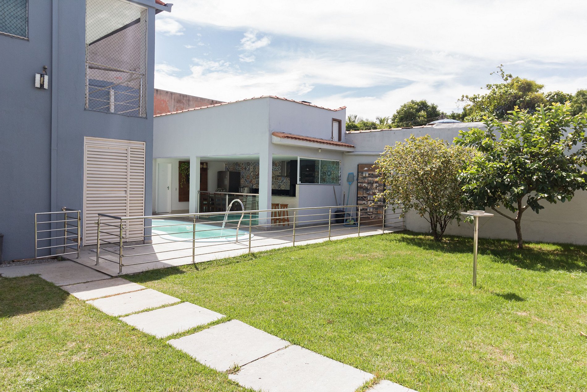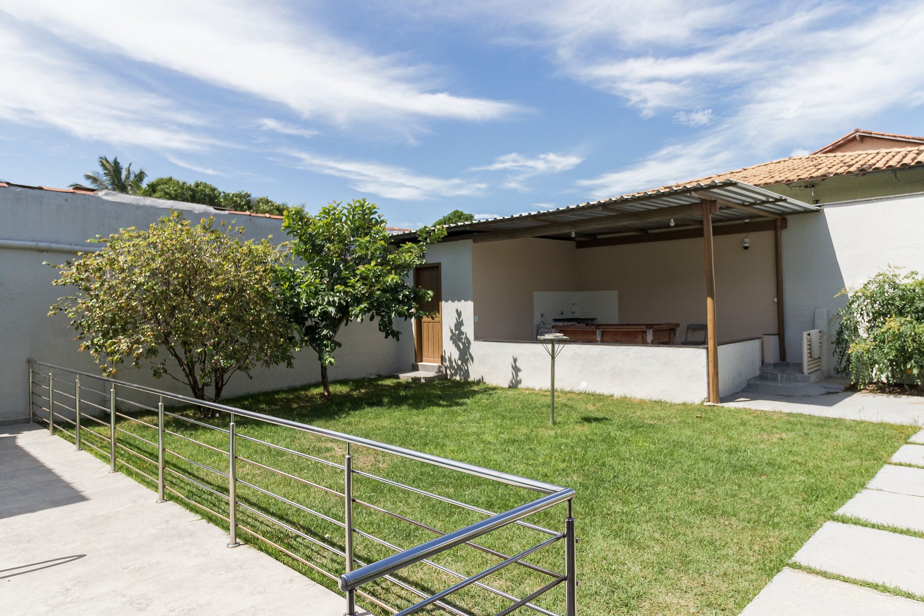 Para grupos que querem mais do que quartos — a casa em Ponta da Fruta tem quintal com piscina, cozinha externa com churrasqueira e espaço para 15 pessoas. A praia e a lagoa ficam a poucos minutos.