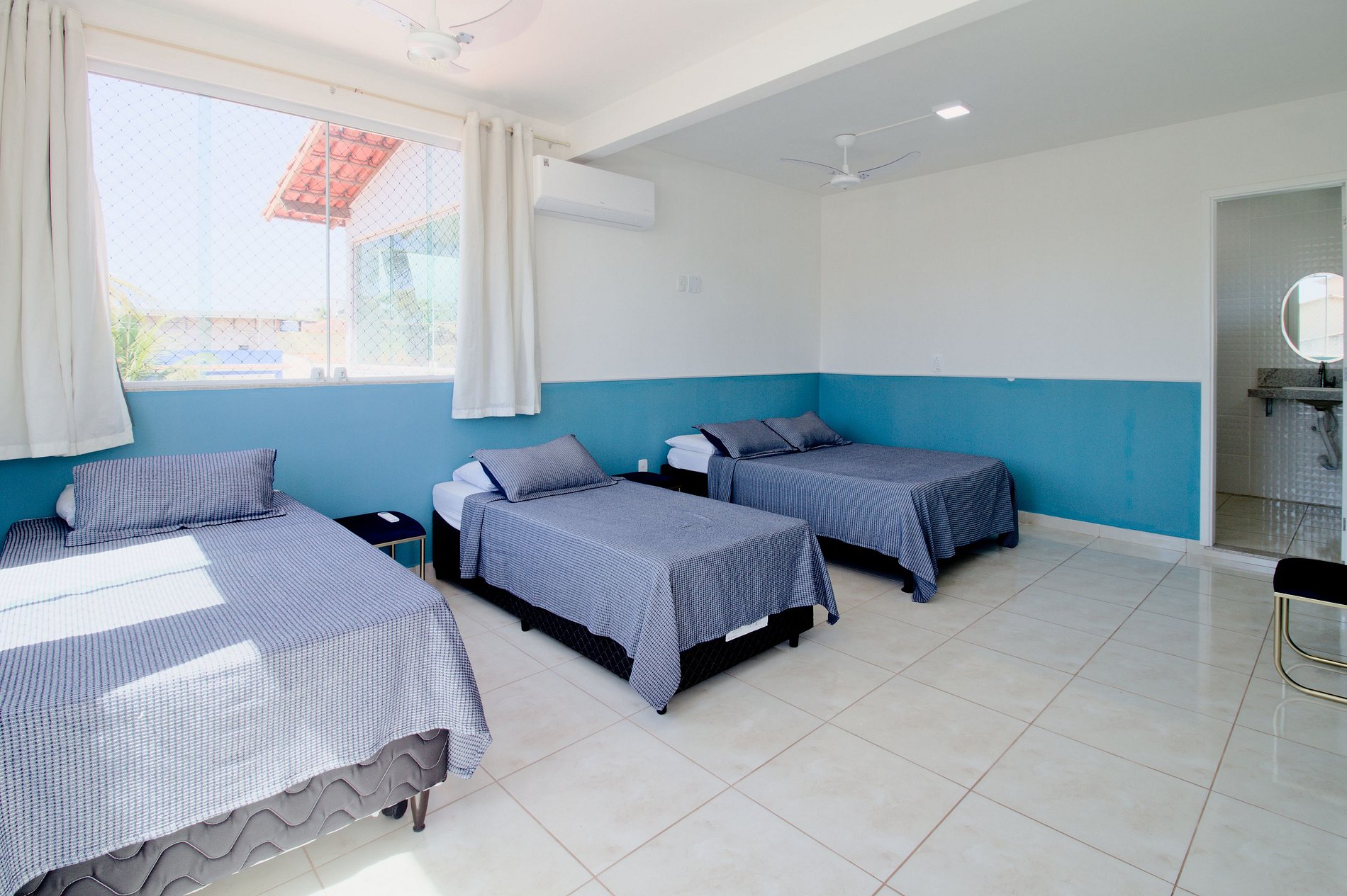 Os três quartos são suítes com ar-condicionado, blackout e banheiro privativo. O quarto principal acomoda mais do que um casal — tem sofá cama e rede além da cama de casal, flexível para famílias com crianças ou grupos que precisam de mais capacidade em um único ambiente. Três vagas de estacionamento no quintal eliminam a logística de carro para grupos que chegam de múltiplos veículos.