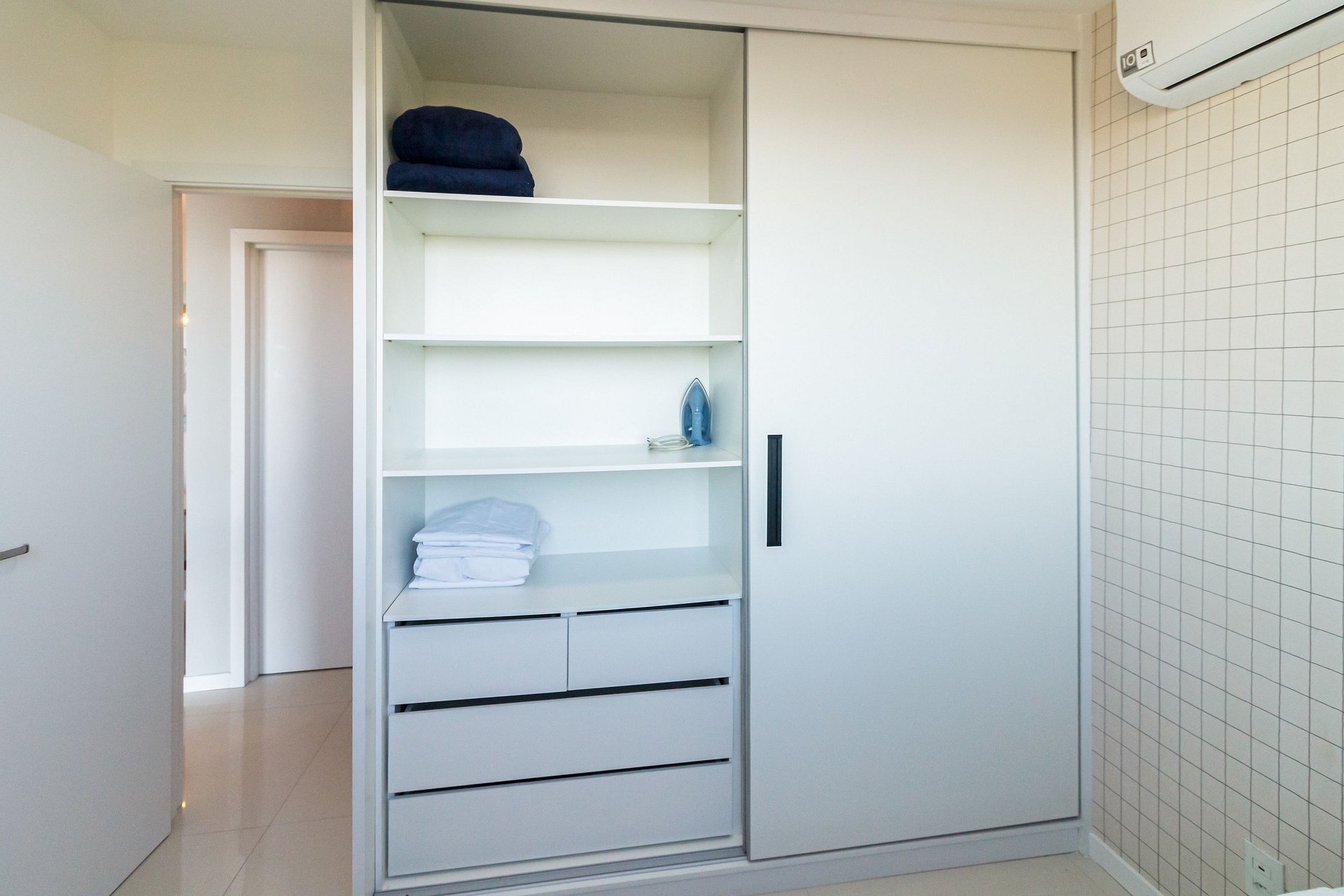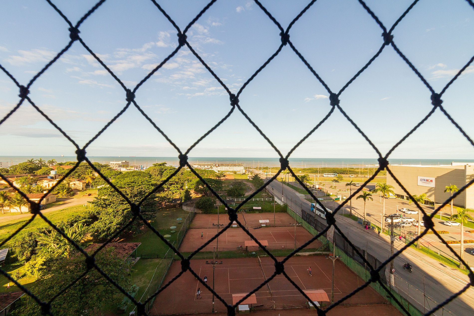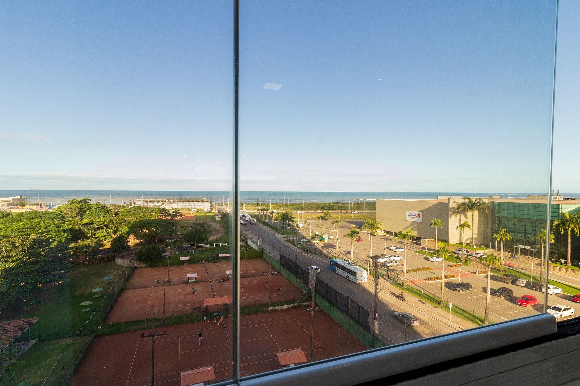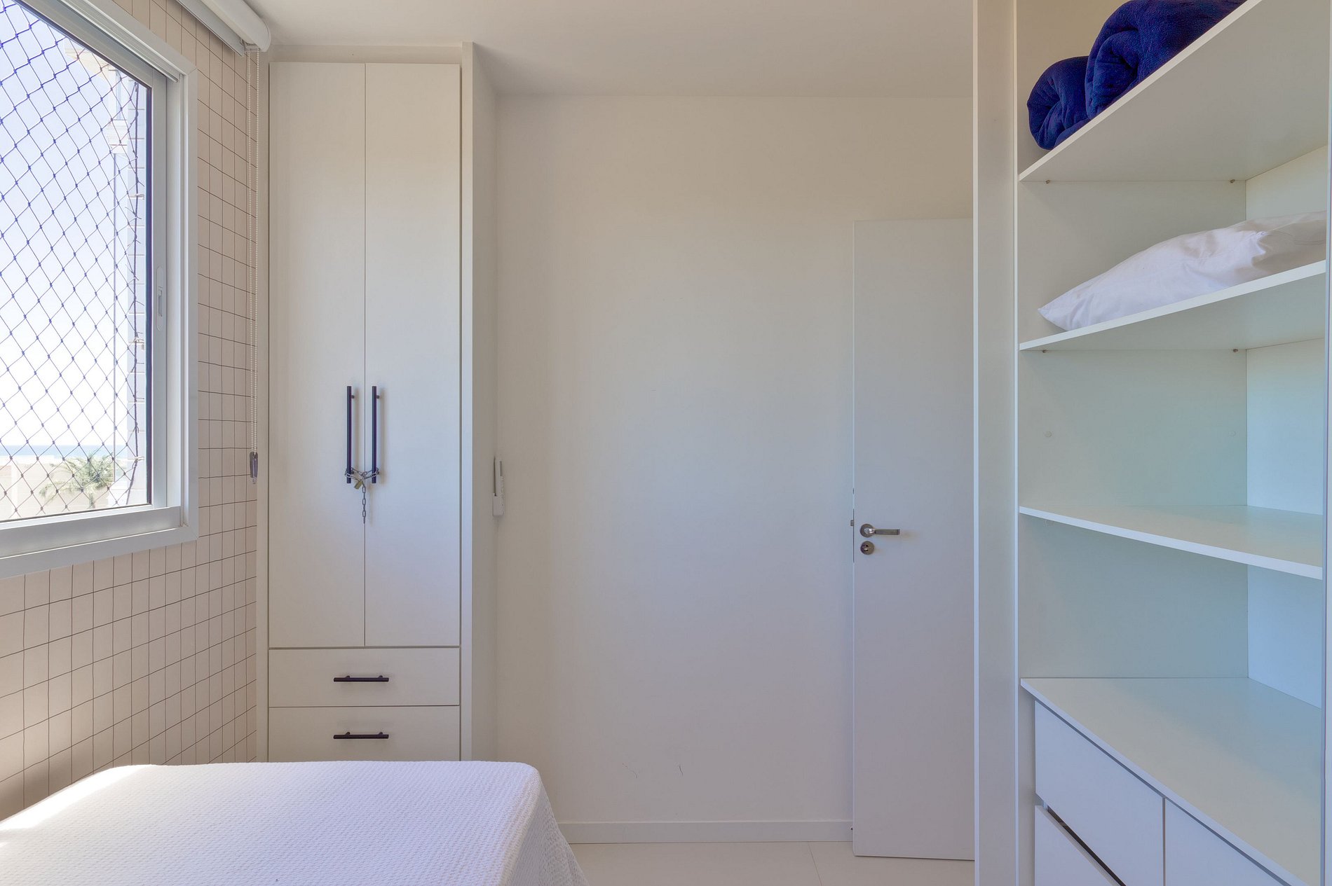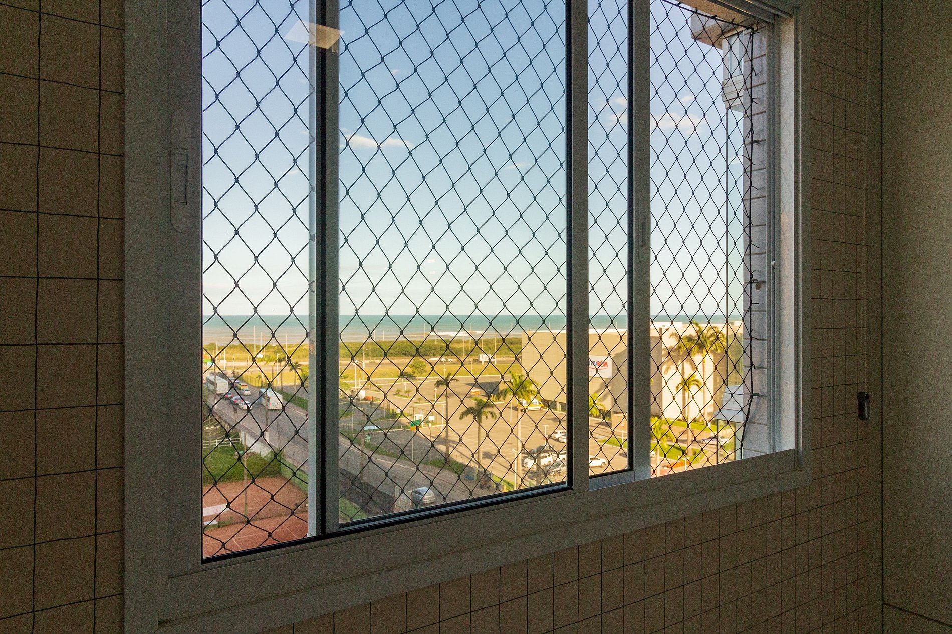 O quarto 1 é suíte — cama de casal, ar-condicionado, armário e blackout. O quarto 2 tem duas camas de solteiro, armário, ar-condicionado e redes de proteção nas janelas. A sala tem varanda fechada com vista para o Jockey e o mar.