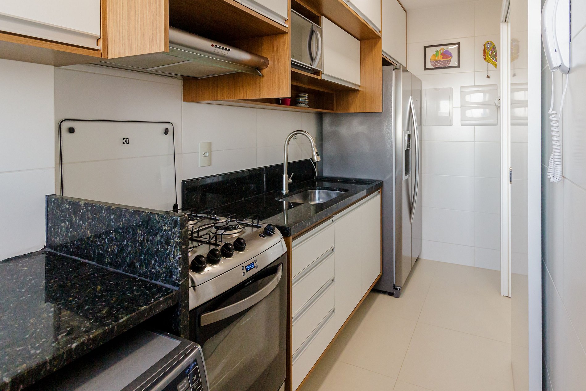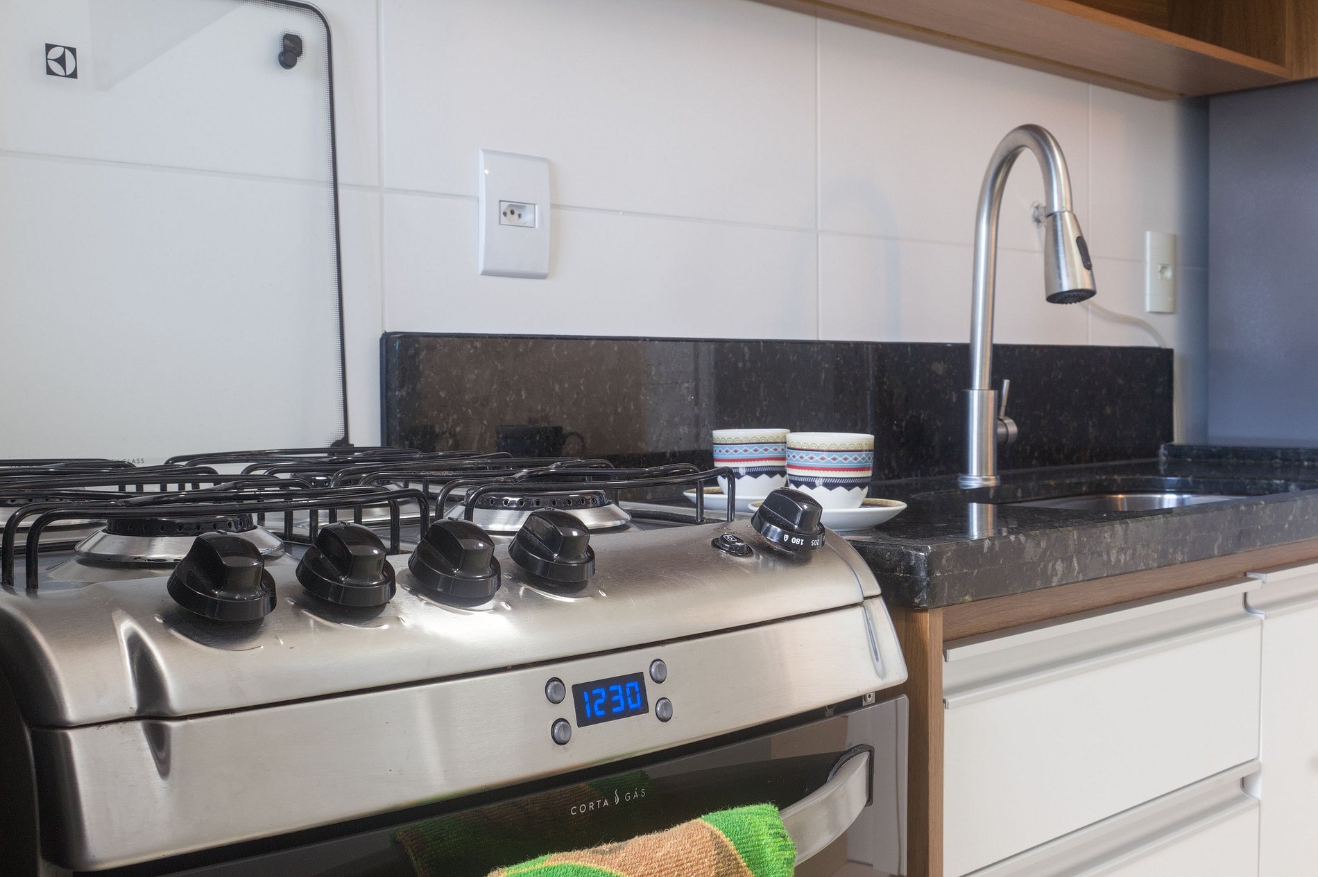 A cozinha é equipada para o dia a dia: fogão, forno, micro-ondas, air fryer, geladeira, liquidificador, sanduicheira e utensílios completos. Filtro de água gelada e natural incluso. A lavanderia integrada conta com lava e seca — sem depender de serviço externo. Banheiros com aquecimento a gás e boa pressão de água. Wi-fi fibra ótica. Smart TV na sala com acesso a streaming mediante conta do hóspede. Fechadura eletrônica. Vaga coberta incluída.